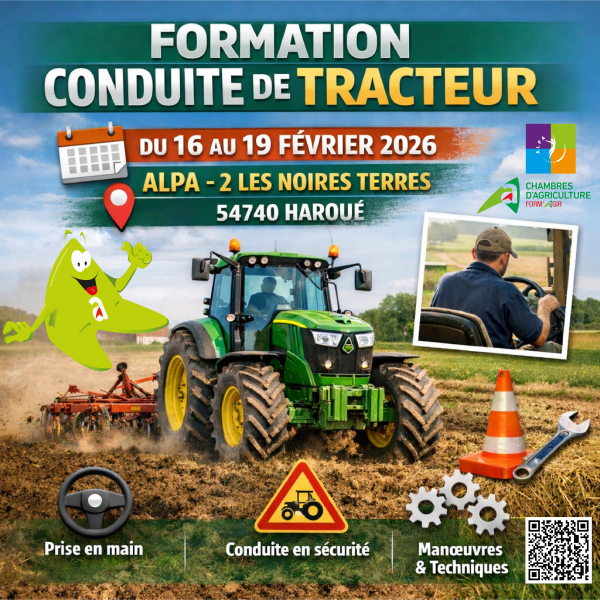 - Initiation à la conduite et l’attelage de tracteur (prochaine session : du 16 au 19 février 2026 à Haroué)