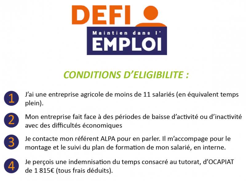 - DÉFI MAINTIEN DANS L’EMPLOI : lorsque l’entreprise traverse des périodes de baisse d’activité ou d’inactivité et qu’elle connait des difficultés économiques passagères ou lors de circonstances exceptionnelles.